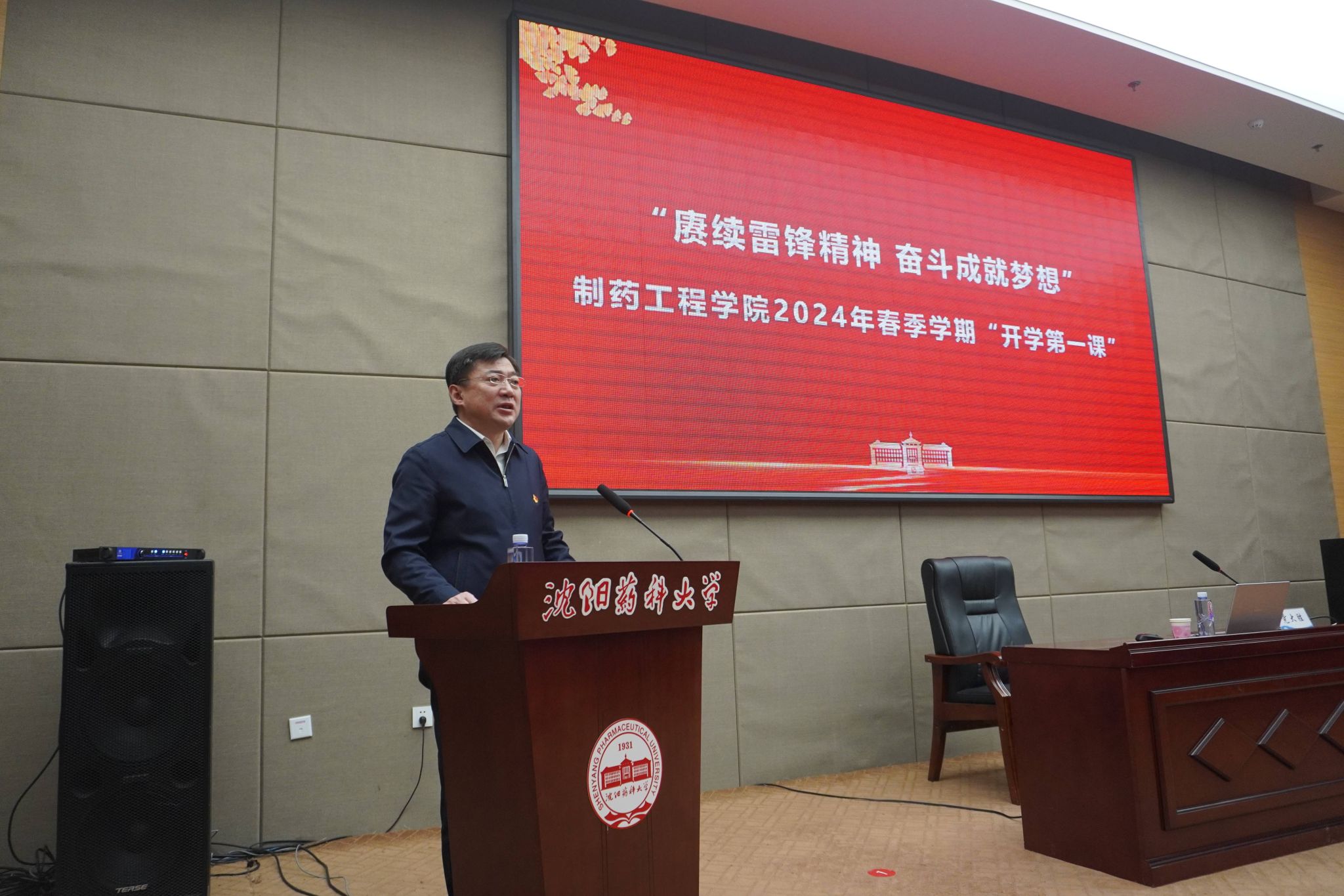为贯彻党的教育方针,落实立德树人根本任务,引领学院师生弘扬雷锋精神,以昂扬的精神面貌奋进新学期,今年会jinnianhui官网于3月7日在南校区图书馆国为学术报告厅举办了以“赓续雷锋精神 奋斗成就梦想”为主题的新学期“开学第一课”活动。本次活动邀请北部战区总医院临床药师党大胜为学院师生授课。校党委副书记关雪峰、学院领导班子成员、全体辅导员以及师生代表参加活动。