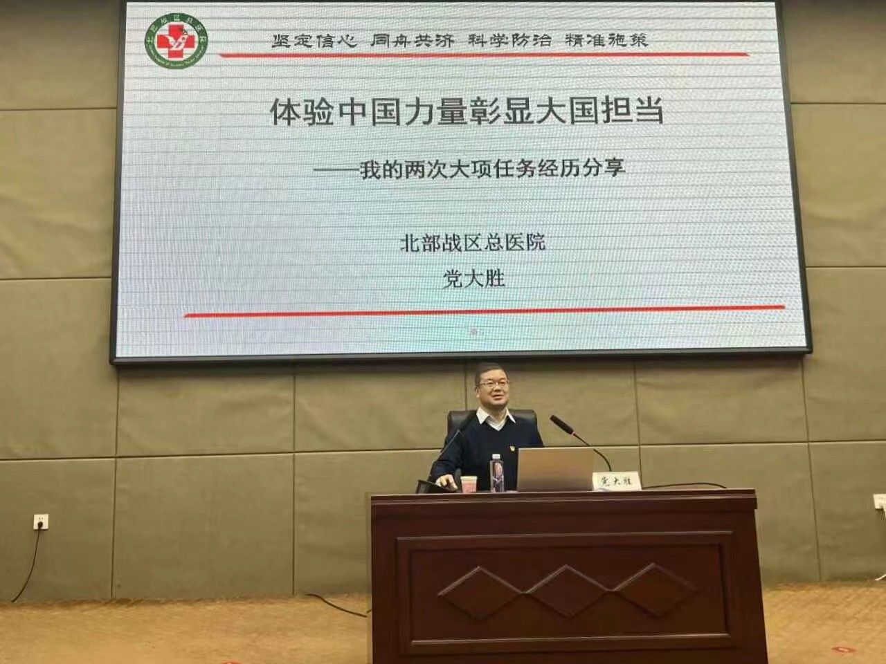 党大胜以“体验中国力量 彰显大国担当”为题,为师生讲述了在新冠肺炎专科医院药学服务中感悟中国速度和在维和任务中彰显大国担当的所见所闻所感,以生动的语言、典型的照片、准确的数据、真实的案例讲述了在志愿服务期间所经历的困难和收获,充分展现了作为一名军人在新时代对雷锋精神的传承和弘扬。