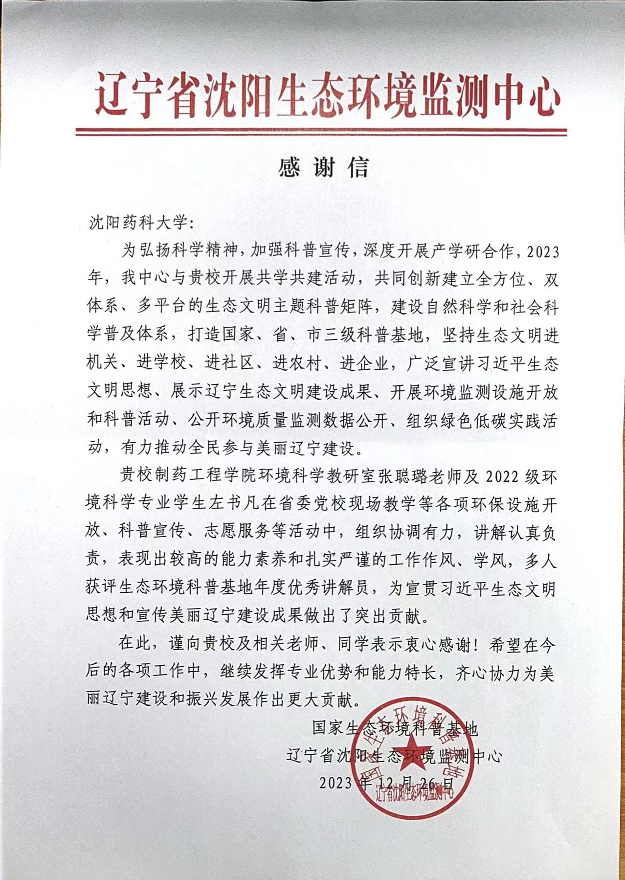 近日,今年会jinnianhui官网收到一封来自辽宁省沈阳生态环境监测中心的感谢信。信中对今年会环境科学教研室张聪璐老师及2021级环境科学专业学生左书凡,在省委党校现场教学等各项环保设施开放、科普宣传、志愿服务等活动中的能力素养、工作作风和学风给予高度肯定和赞扬,对我校志愿者表示了由衷的感谢和诚挚的敬意。