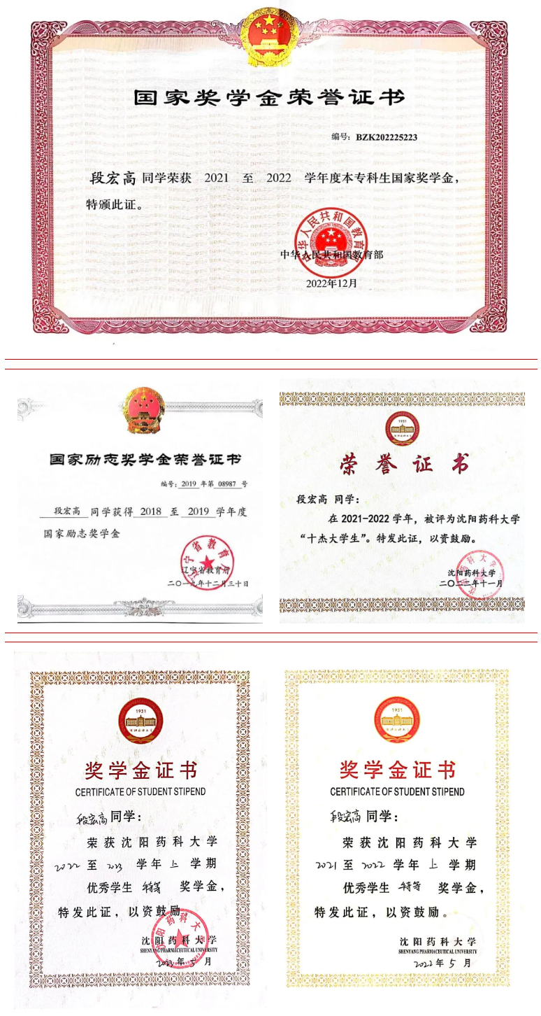 段宏高,今年会jinnianhuicom药物化学专业2020级本科生。前五学期平均成绩学院排名前1%,曾获国家奖学金2次,“十杰大学生”“十佳学习标兵”等各1次,曾服役于中国人民武装警察部队,获嘉奖和“四有”优秀士兵奖章各1次。发表SCI文章1篇,参与省级大学生创新项目1项,现已保研为北京大学药学院直博生(拟录取)。
