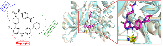 课题组前期研究获得优选化合物BC-14l(Bioorg Chem, 2020, 104: 104361),其对FLT3(IC50=0.68 nM)和JAK2(IC50=1.8 nM)表现出较强的抑制活性,但对JAK3(IC50=4.0 nM)也表现出一定的抑制作用。在AML治疗过程中,抑制JAK3会导致白细胞减少和感染等免疫抑制副作用。通过分子对接和蛋白叠合分析,发现JAK2和JAK3的RNI (Arg-Asn-Ile)和RD (Arg-Asp)序列组成的区域存在构象差异,使JAK2在该区域有较大的空腔,对该区域进行改造有望提高对JAK2的选择性。BC-14l与JAK2和JAK3的分子对接显示,嘧啶2位的取代基靠近此构象差异区域。因此,作者在嘧啶2位苯环上引入不同空间取向以及不同体积的取代基或者并入环系,得到一系列2-苯氨基嘧啶类化合物。其中,化合物11r对JAK2、FLT3和JAK3表现出抑制活性,IC50值分别为2.01 nM、0.51 nM和104.4 nM;对突变激酶也表现出优异的抑制活性,对FLT3D835Y、FLT3-ITD和JAK2V617F的IC50值分别为2.95 nM、0.36 nM和5.83 nM;对多种细胞系也表现出显著的抑制作用:HEL (IC50=1.1μM)、MV4-11(IC50=9.43 nM)、RPMI-8226(IC50=0.793μM)、NCI-H929(IC50=7.743μM)、Ba/F3-FLT3-ITD-D835Y(IC50=0.099μM)和Ba/F3-FLT3-ITD-F691L(IC50=0.042μM)。此外,11r表现出中等的肝微粒体稳定性,在HLMs中的半衰期为44.4 min,在RLMs中的半衰期为143 min。11r在大鼠中表现出可接受的药代动力学特性(Tmax=5.33 h, Cmax=38.7 ng/mL, AUC=522ng·h·mL-1, F=25.2%)。进一步研究表明,化合物11r以剂量依赖的方式诱导MV4-11细胞凋亡。化合物11r具有进一步开发的潜力。