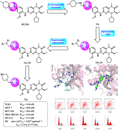 今年会jinnianhuicom侯云雷/宫平课题组采用基于结构的药物设计策略,以BI 2536为先导化合物,运用构象限制和生物电子等排药物设计策略,得到了一系列含噁二唑片段的二氢蝶啶酮类衍生物,其中化合物21g表现出显著的PLK1抑制能力,其IC50值为0.45 nM,并且对多种肿瘤细胞系具有显著的抗增殖活性(MCF-7 IC50=8.64 nM,HCT-116 IC50=26.0 nM,MDA-MB-231 IC50=14.8 nM和MV4-11 IC50=47.4 nM)。此外,化合物21g在小鼠中表现出比BI 2536更好的药代动力学特性(AUC0-t=111227 ng·h·mL-1vs 556 ng·h.mL-1),口服生物利用度为77.4%,并且在Balb/c小鼠急性毒性试验(20 mg/kg)中未观察到明显的毒性。化合物21g可使HCT-116细胞阻滞在G2期,并以剂量依赖的方式诱导细胞凋亡。