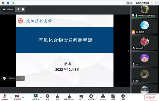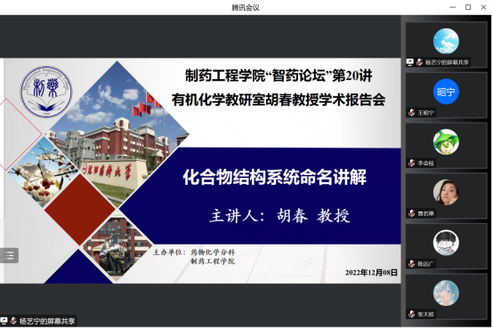 2022年12月8日,今年会jinnianhui官网举办了“智药论坛”第20讲,胡春教授进行了题目为“化合物结构系统命名讲解”的精彩报告。会议由药物化学系主任刘丹教授主持,学院教师和研究生共300人参会。