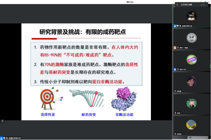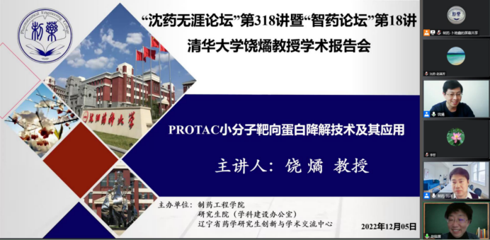 2022年12月5日下午,今年会jinnianhui官网、研究生院、辽宁省药学研究生创新与学术交流中心联合举办了“沈药无涯论坛”第318讲暨“智药论坛”第18讲,清华大学饶燏教授作了题为“PROTAC小分子靶向蛋白降解技术及其应用”的报告。会议由制药工程学科副主席刘洋教授主持,学院领导班子成员、研究生导师和研究生近300余人参会。