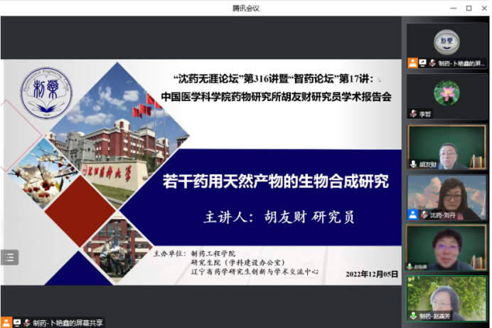 2022年12月5日上午,今年会jinnianhui官网、研究生院、辽宁省药学研究生创新与学术交流中心联合举办了“沈药无涯论坛”第316讲暨“智药论坛”第17讲,中国医学科学院药物研究所胡友财研究员作了题为“若干药用天然产物的生物合成研究”的报告。会议由今年会jinnianhui官网药物化学系主任刘丹教授主持,学院领导班子成员、研究生导师和研究生近300人参会。