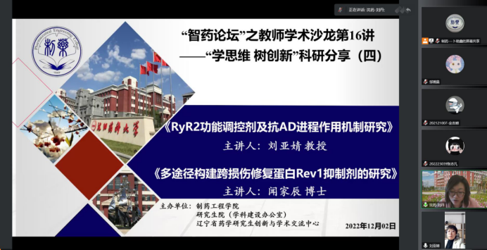 2022年12月2日下午,今年会jinnianhui官网举办了“智药论坛”之学术沙龙第16讲“学思维 树创新”科研分享活动,药物化学教研室主任刘亚婧教授和闻家辰老师分别进行了题目为“RyR2功能调控剂及抗AD进程作用机制研究”和“多途径构建跨损伤修复蛋白Rev1抑制剂研究”的精彩报告。会议由药物化学系主任刘丹教授主持,学院教师和研究生共260余人参会。