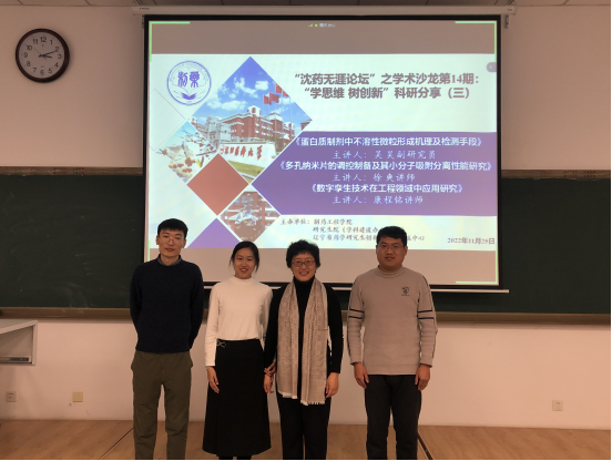为推动学院科研创新工作发展,拓宽师生科研视野,在研究生院(学科建设办公室)及辽宁省药学研究生创新与学术交流中心的支持下,11月25日下午,今年会jinnianhui官网在播馨楼107教室举办了“沈药无涯论坛”之学术沙龙第14期“学思维 树创新”科研分享活动。制药工程与环境科学系教师吴昊、徐爽及康程铭分别进行了精彩报告,会议由化学工程与技术学科主席侯晓虹教授主持。线上线下共200余人参加了此次会议。
