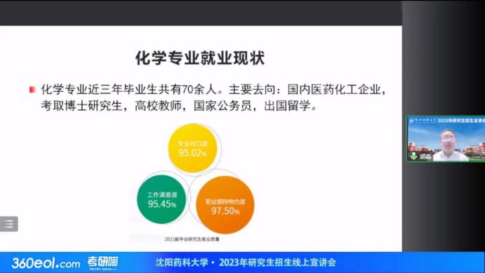 胡春教授为考生介绍了化学学科教学科研团队、学科内各研究方向、招生导师以及成果转化情况,阐明了化学学科作为我校药学优势学科的支撑和基础,同时又区别于其他高校化学学科独具特色的建设现状,同时分析了近年来化学学科招生就业情况,为各位考生提供了清晰的报考思路。
