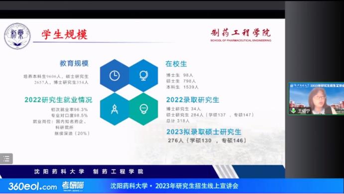 侯晓虹教授从考研动机调查和研究生招生调查出发,阐述了化学工程与技术专业、生物与医药(制药环境工程)专业的报考需求、专业优势和学科特色,展示了化学工程与技术学科的科研团队及导师风采,并对优秀毕业生的就业和升学情况进行了大致的介绍。侯晓虹教授鼓励考生们积极报考,希望在明年能与各位学子在沈药相聚。