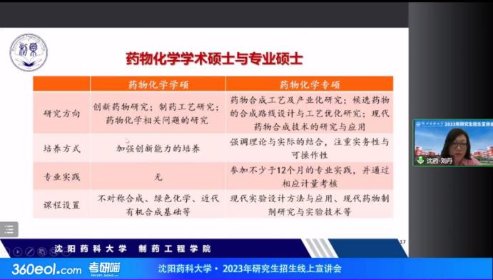 刘丹教授对药物化学学科的主要研究方向进行了详细地讲解,强调药物化学是以新药研发创新为目标,以药物分子设计与合成为主要研究任务的一门学科,处于药学研究中的源头位置。同时,刘丹教授对药物化学方向招生计划、学硕与专硕报考、培养方向的异同以及学科导师进行了深度解读,为考生们提出专业学习方面的建议。