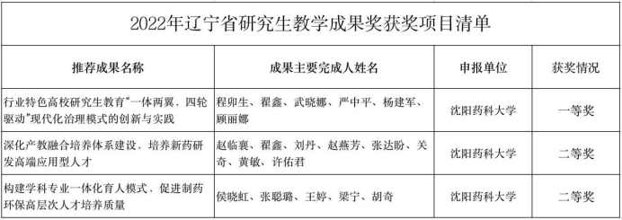 近日,辽宁省教育厅发布了2022年辽宁省研究生教育教学成果奖获奖名单。今年会jinnianhuicom由程卯生教授等组织申报的《行业特色高校研究生教育“一体两翼,四轮驱动”现代化治理模式的创新与实践》荣获一等奖;由赵临襄教授等组织申报的《深化产教融合培养体系建设,培养新药研发高端应用型人才》、由侯晓虹教授等组织申报的《构建学科专业一体化育人模式,促进制药环保高层次人才培养质量》荣获二等奖。