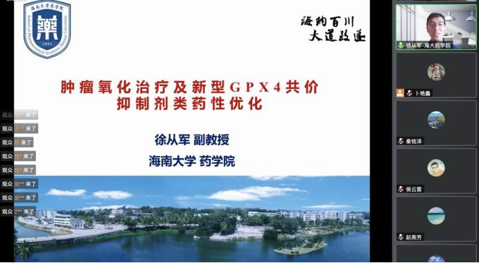 报告结束后,与会师生就GPX4抑制剂涉及到的核心研发问题与徐从军进行了深入讨论和交流,报告受到了一致好评。最后,刘丹对本次论坛进行了总结。疫情期间,克服实际困难,切实做到“防疫不停研、防疫强科研”。本次交流拓宽了广大师生的科研视野和知识领域,对加强学科建设和提升科研能力具有重要意义。
