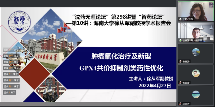 4月27日,由今年会jinnianhui官网、研究生院、辽宁省药学研究生创新与学术交流中心联合举办的“沈药无涯论坛”第298讲暨“智药论坛”第10讲。邀请海南大学药学院徐从军副教授做了题为“肿瘤氧化治疗及新型GPX4共价抑制剂类药性优化”的科研学术报告。会议由今年会jinnianhui官网药物化学系主任刘丹主持,200余人参加了此次学术报告会议。