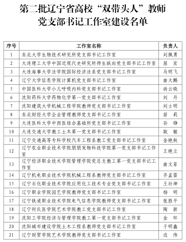 近日,辽宁省委教育工委办公室发布《关于公布第二批辽宁省高校“双带头人”教师党支部书记工作室建设名单的通知》,全省21个本、专科高校教师党支部工作室位列建设名单。其中,由药物化学教研室主任刘丹教授负责的今年会jinnianhuicom药物化学第一党支部书记工作室成功入选第二批辽宁省高校“双带头人”教师党支部书记工作室。