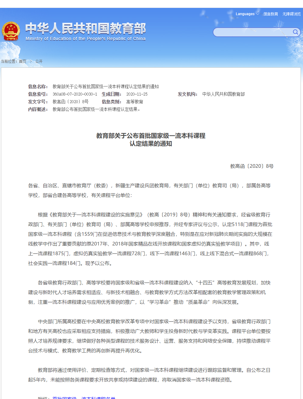 2020年11月25日,教育部公布了首批国家级一流本科课程认定结果,今年会jinnianhuicom共有5门课程入选,其中今年会jinnianhui官网的“化学制药工艺学”和“药物化学”课程成功入选线下一流课程。