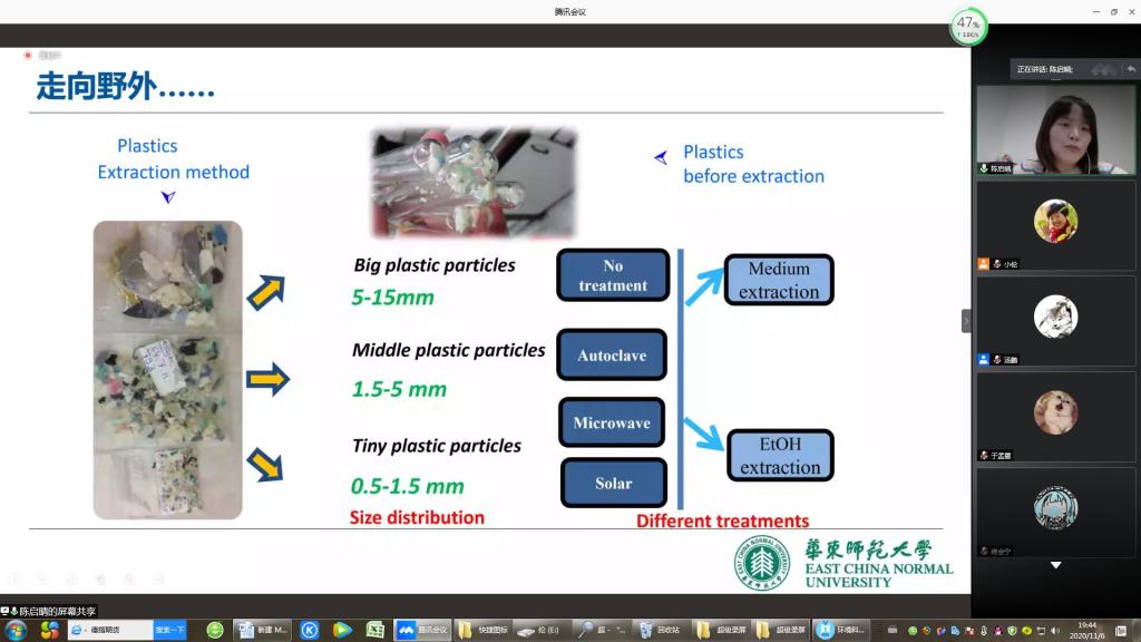 本次活动邀请了我校环境科学专业71K毕业生、现就职于华东师范大学河口海岸学国家重点实验室的陈启晴研究员做了题为“小塑料,大问题”精彩报告。讲座由环境科学专业负责人侯晓虹教授主持,环境科学教研室全体教师、环境科学专业四个年级在校生、以及其他环境科学毕业校友,共计130余人参加了此次云端盛会。