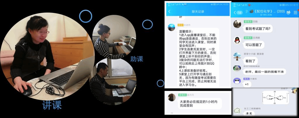 为了保证《配位化学》课程的顺利进行,团队采用课前试课、课中助课,实现直播与超星平台的完美结合。在周密安排和精心准备下,开学第一天的5-8节,团队教师通力协作,主讲教师刘迎春副教授顺利完成首次课程直播,直播课堂井然有序,教师声音画面清晰,师生互动及时,赢得了学生的肯定和点赞。