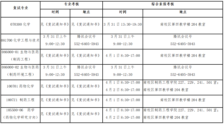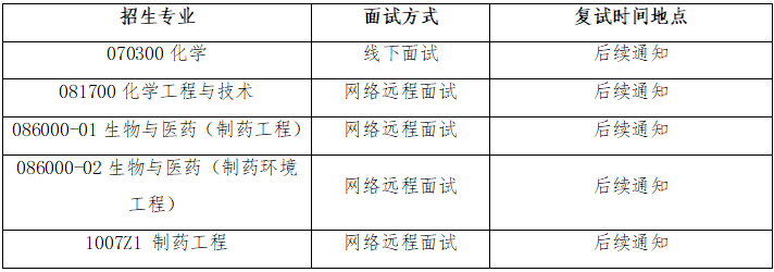 2.调剂考生复试: 4月6日-4月13日,具体安排以制药工程学院各招生学科通知为准。