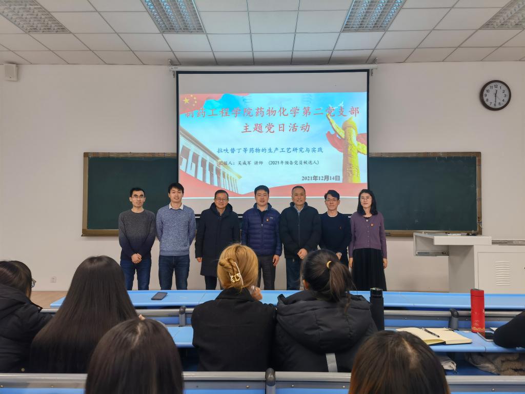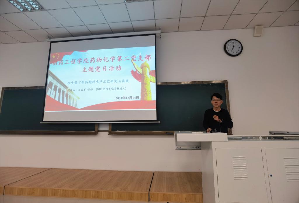 本次活动面向学院药物化学、制药工程及生物与医药专业二年级研究生,他们当前已开展各自课题,并在实验过程中存在一定的研究困难,为了更好地帮助他们解决工艺研究过程中难点问题,本次党日活动安排了药化二支部入党积极分子吴成军讲师,作了关于工艺学课题研究的心得报告。