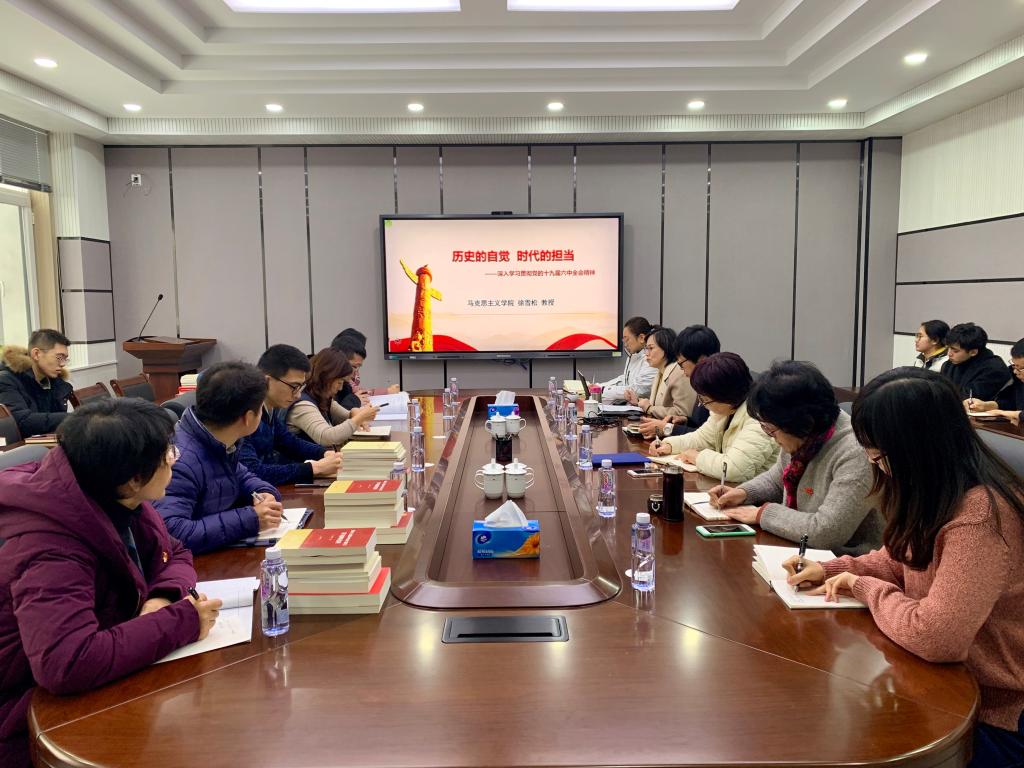 11月30日,今年会jinnianhui官网党委在制药楼227会议室召开理论学习中心组学习会,专题研讨深入学习贯彻党的十九届六中全会精神,特邀马克思主义学院形势与政策教研室徐雪松教授作《历史的自觉 时代的担当——深入学习贯彻党的十九届六中全会精神》专题讲座,学院领导班子成员、系主任、院工会主席、党支部书记、全体学生工作干部参会,会议由院党委书记李哲主持。