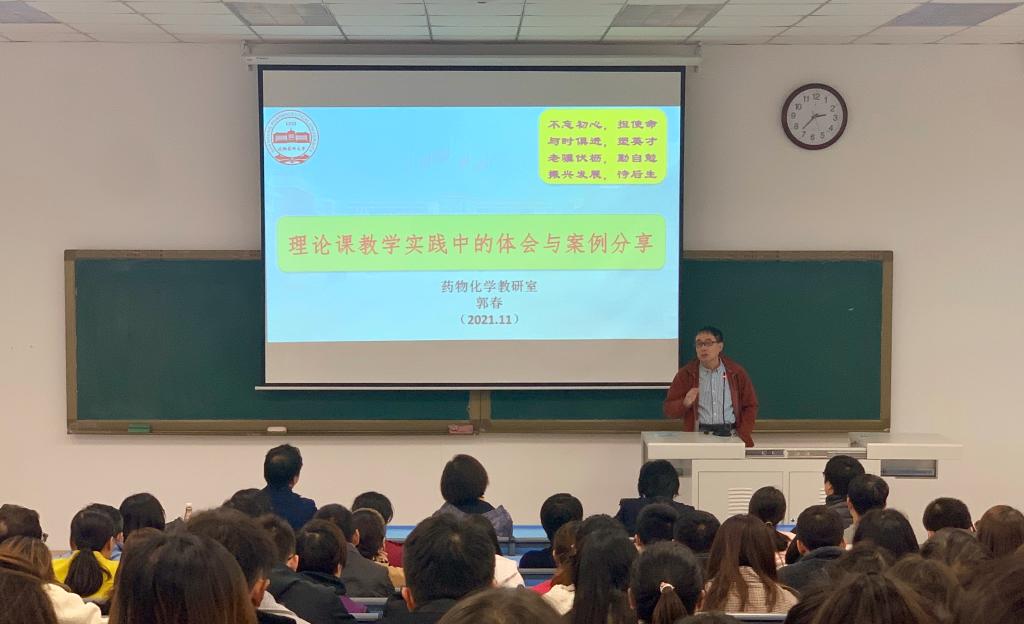 郭春教授以韩愈的《师说》开场,通过对教师责任的阐述,明确了教书授课对于大学人才培养的重要性,并以D(消化)&R(再加工)&I(讲解)概念详细解释了教师在课堂教学中的作用。郭春教授从课前准备、课堂教学和教学评价三个方向提出完善教学质量,提升教学能力的方法举措,建议教师们从文献、科研成果等方面丰富教学内容,增加学生学习热情,开阔学生眼界。随后,郭春教授与参会教师分享了自己的教学工作感悟,希望大家能够不忘育人初心,牢记教师使命,提升业务能力,为培养优秀的药学人才做出更大的贡献。